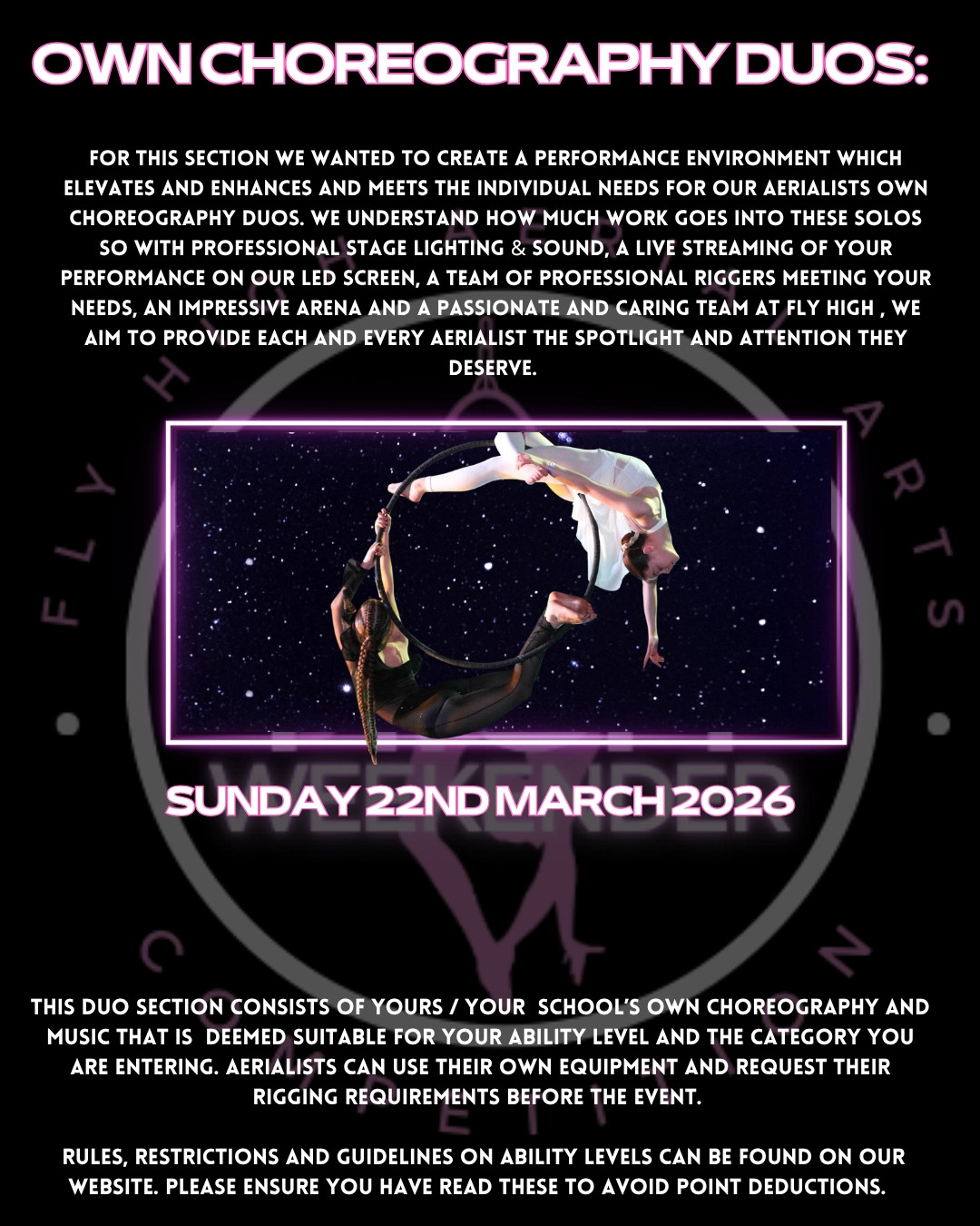 We are also offering Own Choreography DUOS at this event.We will offer these Duos in Aerial Hoop & Aerial Silks. Information can be found in the posters below. Click on the image